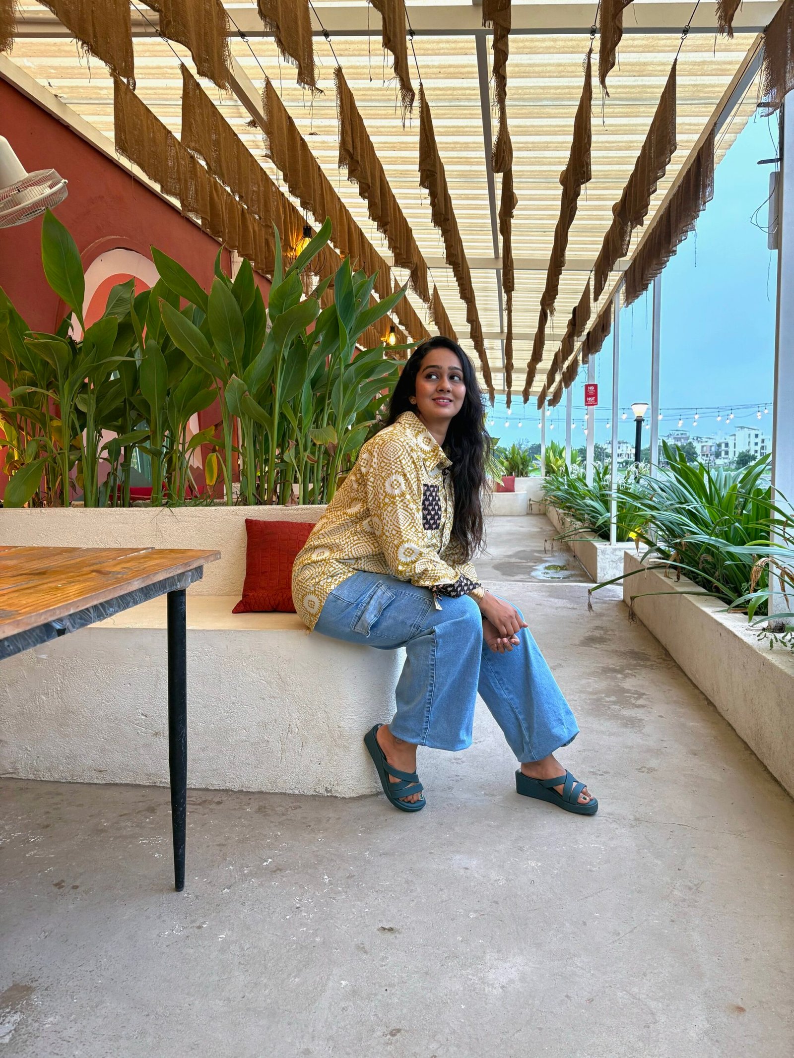 OR Tuck it into beige or white linen trousers. Add a sleek belt and loafers for a polished, professional look. OR Layer with a long shrug or open jacket, wear with a flared skirt, and accessorize with oxidized jewelry.